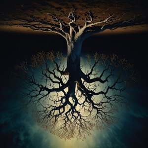 Sua base mergulha no invisível, enquanto o caule rasga o solo da matéria.